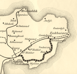 IJzeren Spoorweg Maatschappij. De afstand Hoorn-Venhuizen-Enkhuizen wordt afgelegd in 67 minuten.