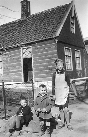 Onderstaande foto is genomen omstreeks 1942. Op de achtergrond is de wegzijde van het langgerekte huis te zien met van links naar rechts Klasina (roepnaam Ina) Compas (geboren
