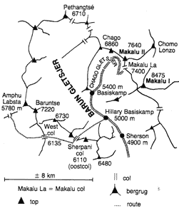 De dubbele stippellijn geeft de heen-en-terugroute van de Nederlandse expeditie naar de Makalu 2 aan.