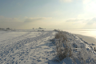 Foto 1: De besneeuwde Uiterdijk met een bevroren Markermeer.